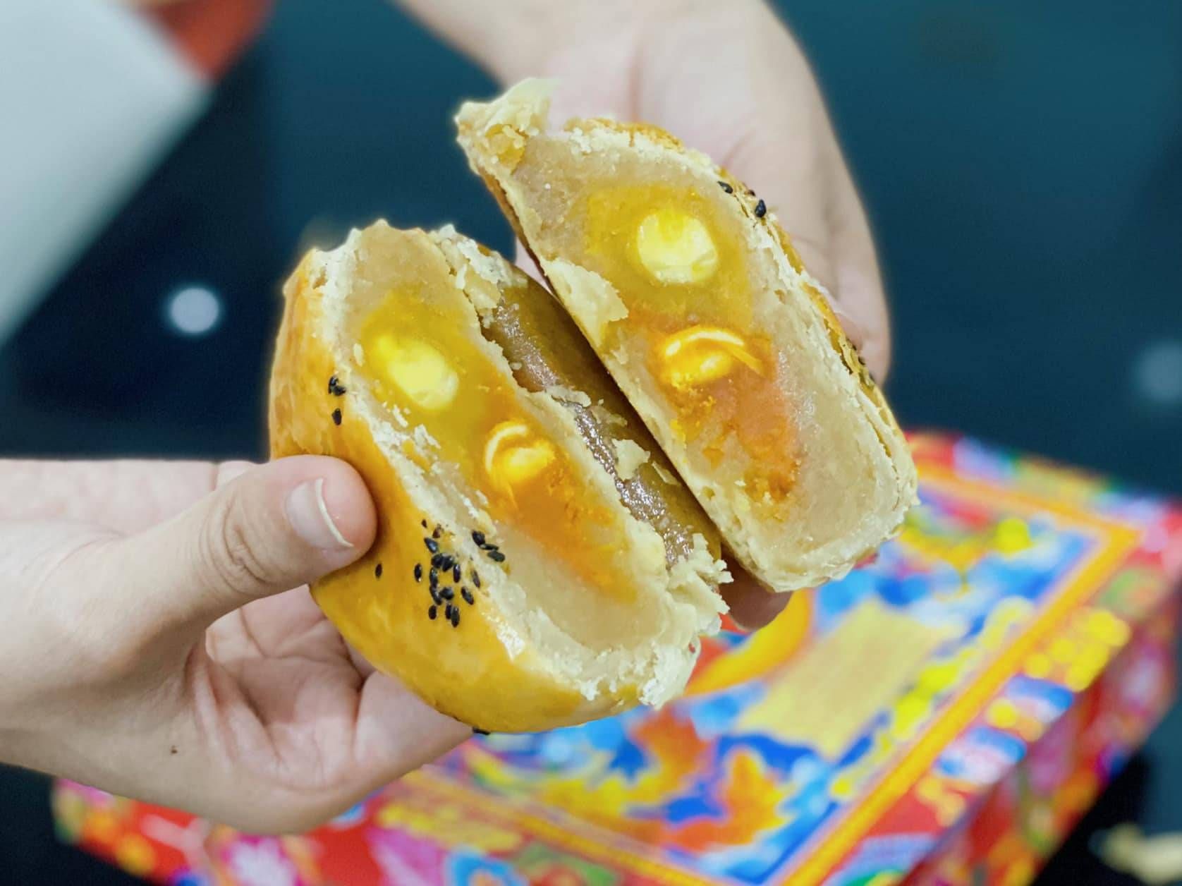 Lòng đỏ trứng muối được đặt ở trung tâm, bao quanh bởi lớp nhân đậu hoặc khoai môn. Vị mặn béo của trứng giúp cân bằng tổng thể, làm nổi bật đặc trưng của bánh trung thu người Triều Châu.